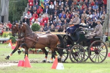 Germany was represented with two lady drivers for the first time in history: German pair champion Carola Diener as a team member and 15-year-old Anna Sandmann as an individual competitor. Carola set the basis for her first world medal in the dressage test, which she won ahead of the experienced drivers Beat Schenk (SUI) and Georg Moser (AUT). Diener, who is the stable manager of German international four-in-hand driver Christoph Sandmann, came 12th in the marathon but kept her lead in the individual standings. The marathon was won by 24-year-old Tom Engbers, ahead of Tibor Nagy jr. (HUN), aged only 21. Diener was last to go in the very difficult obstacle driving competition, designed by Barry Hunter (GBR). Going into the last phase, Carola had one ball in hand as well as some time penalties but the professional horsewoman that she is kept her cool leaving all the balls on the cones and recording only 1,94 penalty points for exceeding the time allowed. “It is an incredible feeling to be the new world champion, but it hasn’t quite sunk in yet,” she said.