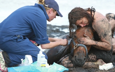 Our hearts go out to Nicole Graham who stayed with her horse, Astro, for three hours as rescuers raced against an incoming tide to free him, after he became stuck in thick mud at Avalon Beach near Geelong, Victoria.