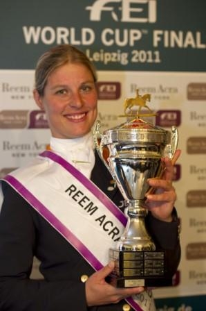| Adelinde Cornelissen (NED), the new Dressage number one rider, is pictured here with the FEI World Cup™ Dressage which she won in April. (c) Kit Houghton/FEI |