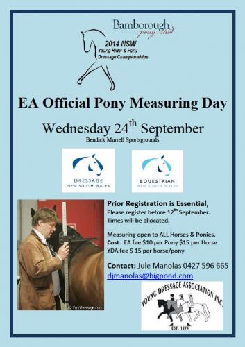 In lead up to the 2014 Bamborough NSW Young Rider & Pony Dressage Championships being held on 24-26 September, Bamborough Pony Stud is holding an EA Official Pony Measuring Day on 24 September 2014.
