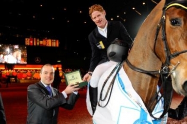 Germany's Marcus Ehning, winner of today's ninth leg of the 2010/2011 Rolex FEI World Cup™ Jumping series in Zurich, Switzerland is presented with a Rolex watch by Mr Pedro Reiser, Market Manager Rolex Switzerland. (Photo: Katja Stuppia/FEI. Story: Louise Parkes/FEI) |