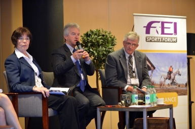 L-R: Ruth Carlson, chair of the FEI Endurance Committee; Ian Williams, FEI Director, Non-Olympic Sports; Brian Sheehan, FEI Endurance Committee member, at today’s Round Table. © Edouard Curchod/FEI |