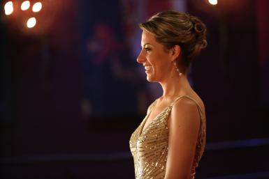 | Charlotte Dujardin, the double Olympic gold medallist and world Dressage number one, is pictured at the FEI Awards 2013 ceremony in Lausanne (SUI), where she collected her Reem Acra Best Athlete award dressed in a stunning Reem Acra creation. (FEI/Anthony Demierre) |