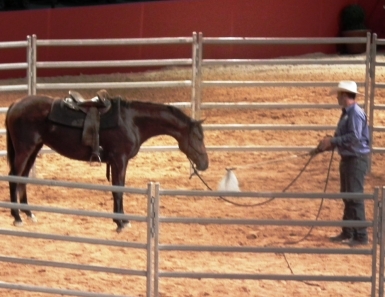 The Way of the Horse took over the Dome arena again this afternoon, with the competition hotting up! By the end of the day Greg Powell was riding his little horse around bareback, with a roller and saddle pad. David Manchon and Dan Maloney were getting on well with theirs and both had saddles on, but hadn't mounted up at this stage. All horses and trainers look to be progressing really well and everyone is keen for the outcome tomorrow.