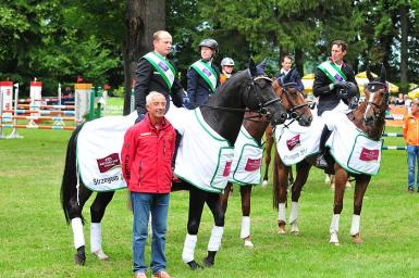 | The winning German team at Strzegom (POL), fourth leg of the FEI Nations Cup™ 2014 (mounted, left to right): Michael Jung, Sandra Auffarth and Dirk Schrade with their chef d’equipe Hans Melzer. (Photo: Leszek Wojcik/FEI). |