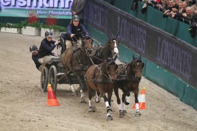Schneiders, who recently sold his outdoor four-in-hand team in the USA, used the 13-year old KWPN Hermes as his wheeler horse for the second time this season. After his somewhat disappointing results at London Olympia where he had driven the gelding for the first time, Schneiders was now able to make full use of the horses’ potential, which resulted in two fabulous clear and fast rounds. Being the second man in the arena in the winning round, Schneiders decided to see how fast his team would go. The former pony four-in-hand driver crossed the finishing line in an incredibly fast time and the spectators in the sold-out Messehalle in Leipzig rewarded his phenomenal performance with a deserved standing ovation.