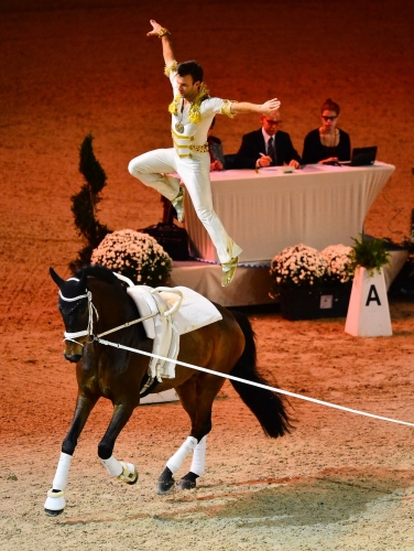 Lukas Klouda (CZE) on Danny Boy lunged by his coach and former World and European champion Patric Looser, secured the male individual competition at the opening qualifier of the FEI World Cup™ Vaulting 2013/2014 series in Munich. Story & Photo: Daniel Kaiser/FEI |