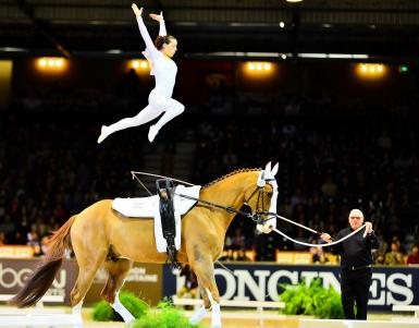 Anna Cavallaro (ITA) convinced the judges yet again of her star quality with Harley, lunged by her coach Nelson Vidoni, and retained the coveted FEI World Cup™ Vaulting title at the Final in Bordeaux (FRA). Photo & Story: Daniel Kaiser/FEI |