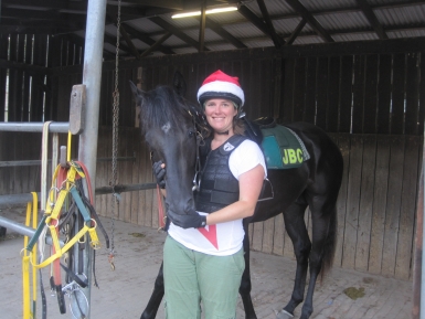 Firestorm is pictured at right with his track rider, Georgia Fasher, who says, "he is a well mannered and calm horse to ride who goes about his work and not much phases him. Like any colt he can be cheeky, but he loves a scratch and will put his head over the box door for a pat."