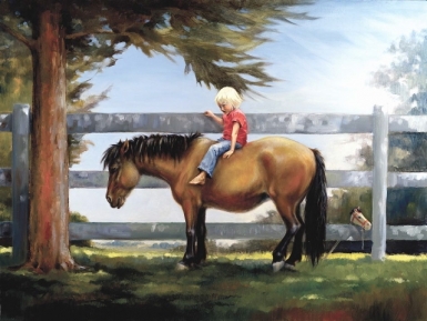 Hard to say, as just being around horses is wonderful. I suppose the most memorable experience was when I first sat astride the bare back of my three-year-old thoroughbred filly, Lasca, whom I had bred and was 'breaking-in' by the Jeffery Method. It was magic. Having said that, I can still remember the warmth, the smell and the feel of sitting on a real pony for the very first time. I painted 'Twelve Hands Nearer Heaven' from those memories (right).