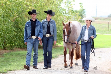 | The Rockin Horse Ranch Team: L-R Kane Skopp, Holly and Carolyn, with Smoochin (photo: Crazy Horse Photography) |