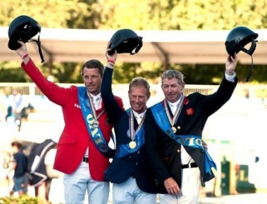 | The individual medallists pictured on the podium on the final day of the FEI European Jumping Championships 2011 in Madrid, Spain this evening - L to R - Silver medallist Carsten-Otto Nagel from Germany, Gold medallist Rolf-Goran Bengtsson from Sweden and Bronze medallist Nick Skelton from Great Britain. Photo: Kit Houghton/FEI Story: Louise Parkes/FEI. |