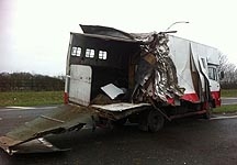 The impact ripped the box open and threw the horse on the end out on to the road.