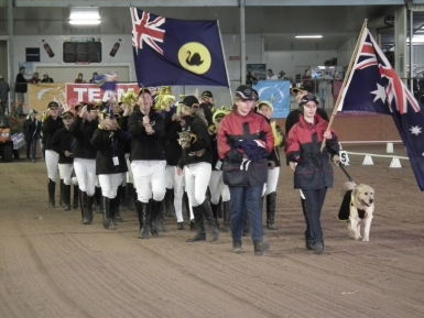 The opening ceremony, held late this afternoon, was kicked off by the Scots PGC College Pipe Band, with the type of pomp and ceremony that only bagpipes can produce. Then all teams proceeded to bounce into the arena, with their mascots (cute dogs and stuffed animals) and flags. I say bounce because they were such an excited bunch! From the ear to ear grins, all participants were obviously thrilled to be there, but I think Western Australia (pictured) and Queensland were the noisiest and most boisterous. It was a wonderful spectacle and lovely to see the competitors really getting into the spirit of the Nationals - their enthusiasm was infectious. See more photos in the Gallery.