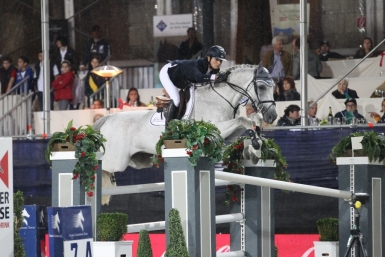 Pénélope (pictured left) rode into the ring on her amazing grey Mylord Carthago and had a lucky break early on with a top rail. She was faster than Meredith as she raced to the last and seized victory in 37.16.