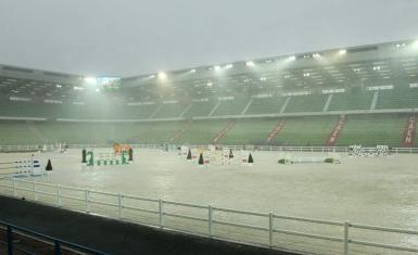 Torrential rain during this afternoon’s final Jumping test event before the Alltech FEI World Equestrian Games™ 2014 get underway on 23 August gave organisers and athletes the best possible opportunity to see how the footing in both the competition and training arenas at d’Ornano Stadium in Caen (FRA) would perform in tough conditions.