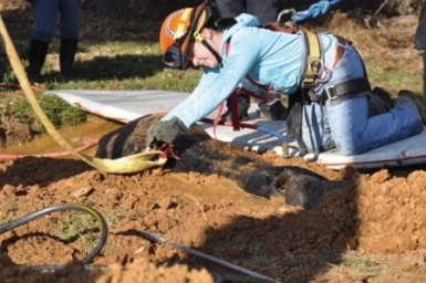 Equine vets and emergency responders need this training because any horse trapped in mud, a sinkhole, septic tank, overturned float or any other similar predicament is incredibly dangerous. Because horses are prey animals, their first instinct when threatened or trapped is to run away but if they can't flee they will fight - and they fight hard. If owners are unable to help the horse to self-rescue, they should dial 000 for help. It may seem contradictory to tell them to call 000 but, whether they know it or not, emergency services have equipment that can be adapted to rescue large animals and they work within a tightly-structured system that ensures the safety of all involved.