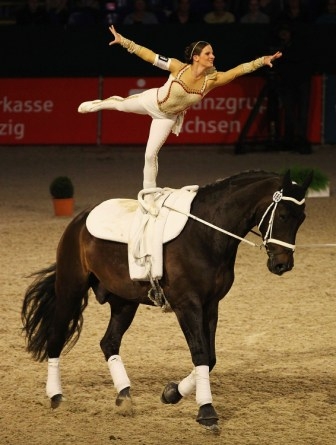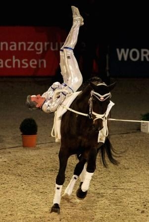 In modern vaulting, the horse's score counts for 20% of the score and Looser's handsome horse Record RS vond der Wintermuhle, handled with the most subtle of skills by longeur Alexandra Knauf, added quality and calmness to the picture of the perfection.