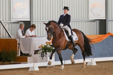 Prestige VDL (also known as MR P) was bred by VDL stud and initially trained by Edward Gal. He is a beautiful bay stallion 16.3 hh with four white socks and blaze, with the most amazing paces and temperament to match. He is by the Olympic Stallion Silvano N.