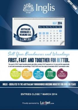 There is a new date and format to headline Australia's thoroughbred breeding stock sales, with the modern streamlined Inglis Australian Broodmare and Weanling Sale to be conducted in Sydney on 4, 5, 6 and 7 May 2014.