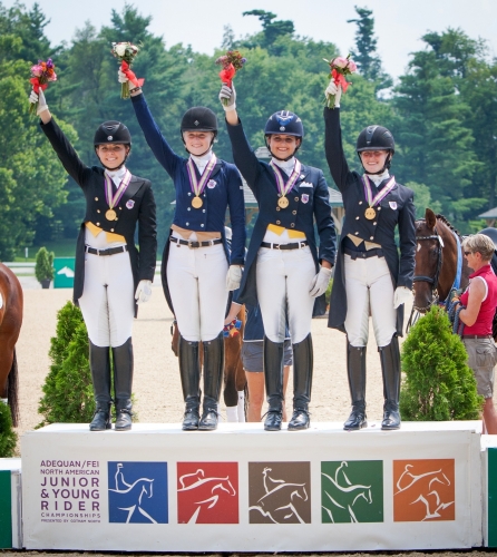 Junior Team Dressage Championship: GOLD - Canada Quebec 201.864: Windbreaker (Naima Moreira Laliberte) 67.054, Lowelas (Laurence Blais Tetreault) 63.378, Pissarro (Felixe Cote Villeneuve) 62.865, Dante (Betrice Boucher) 66.432; SILVER - USA Region 7, 201.46; Stentano (Olivia Zeilinger) 68.811, Zodessa (Gabriela Glumac) 63.838, Venezia (Rison Naness) 66.73, Valliant (Lindsey Brewin) 65.919: BRONZE - USA Region 3, 196.865: Friedensfurst (Lindsey Holleger) 67.757, Okidokie (Mallory Kent) 66.027, Ucarius (Rachel Robinson) 63.081, Wild Tiger (Jamie Doolittle) 57.703.
