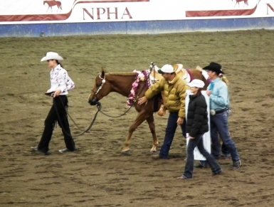 | Winner of the Jayes Park $20,000 Two Year Old Western Pleasure Futurity, Gracefull Prophecy, was showered in pats by all her connections |