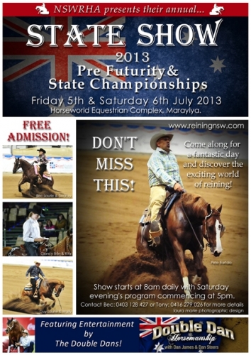 The NSW Reining Horse Association proudly presents the Pre Futurity and State Show 2013 on 4-6 July at Horseworld, Maraylya.