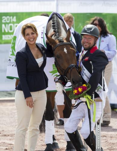 | FEI President HRH Princess Haya celebrates freestyle medal day at the Alltech FEI World Equestrian Games™ 2014 in Normandy (FRA) with triple gold medallists Zion and Lee Pearson (GBR), the world’s most successful Para-Equestrian Dressage athlete. (Leanjo de Koster/FEI) |