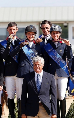 Team France, young rider gold medallists at the European Championships in Ebreichsdorf (AUT), from left: Thibault Pigeon, Margaux Bost, Alexandre Fontanelle and Maelle Martin, with Chef d'Equipe Thierry Pomel. Photo: FEI/Tomas Holcbecher Story: FEI/Anna Williams |