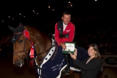 | Switzerland's Pius Schwizer, winner of the opening leg of the Rolex FEI World Cup™ Jumping 2011/2012 series at Oslo, Norway today riding Carlina, is presented with a Rolex watch by Magali Dubois Vaucher from Rolex. Photo: FEI/Roger Svalsrod Story: FEI/Louise Parkes. |