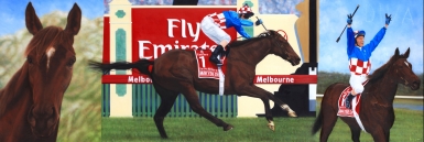 The Makybe Diva Portrait, by award winning Australian artist Michael Legge-Wilkinson was painted under license to the Diva’s owners for a limited edition print run that celebrates the Diva’s win in the 2005 Melbourne Cup, when the “Champion became a Legend”. The artist created the painting over three years, from 2006 to 2008, investing over 1000 hours of brushwork to capture every muscle and sinew in a representational portrait of the highest standard. The limited edition prints have been sold and now the original is available to investors, exclusively through this fundraising auction and in support of the Racehorse Rehabilitation Trust.