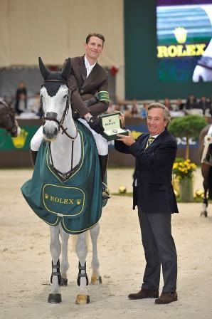 Kevin Staut from France, riding Silvana de Hus, accepts a Rolex watch from Mr Jean-Noel Bioull of Rolex as winner of today's sixth leg of the 2010/2011 Rolex FEI World Cup™ Jumping series in Geneva, Switzerland.