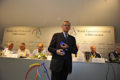 | FEI Jumping Director, John Roche, in the foreground at today’s FEI Nations Cup™ 2012 Draw Press Conference in Aachen, Germany where the fifth leg of the series will take place tomorrow evening. Photo: FEI/Kit Houghton Story: FEI/Louise Parkes |
