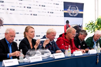 | Pictured today at the Draw Press Conference for the sixth leg of the FEI Nations Cup™ which takes place tomorrow afternoon in Falsterbo, Sweden are: (L to R) Falsterbo Show Director Jan-Olaf Wannius, FEI Commercial Manager Nathalie Taylor, British Chef d’Equipe Rob Hoekstra, German Chef d’Equipe Heinrich Hermann Engemann, Swiss Chef d’Equipe Stephane Montavon and Irish Chef d’Equipe Robert Splaine. Photo: FEI/Lotta Gyllensten Story: FEI/Louise Parkes |