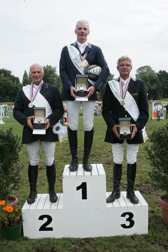 | Individual medallists at the FEI European Jumping Championships for Veterans 2012 at Dinard, France - (left to right) - silver medallist Danny Stappaerts (BEL), gold medallist Jean-Jacques Lorquet (BEL) and Bulgaria’s Gunter Orschel who claimed bronze. Photo: FEI/Rob Smith Story: FEI/Louise Parkes. |