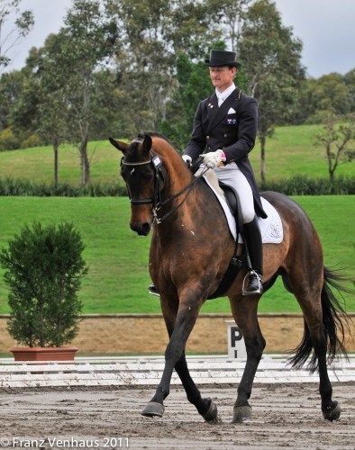 Narbethong principal, Kate Barton, comments about Bellario's perfect 10 score saying, "We were totally thrilled that Anna-Sophie was so impressed with Bellario! I purchased him as a two and a half year old in Germany, he was broken in over there and then imported into Australia as a three year old. While he was still in Germany he served 15 mares and 10 out of the 15 served have produced elite foals. Our aim is for Bellario to compete in the advanced class at Sydney next year and then go on to compete internationally in FEI. As he advances through the grades his competition career will take precedence over his breeding duties."