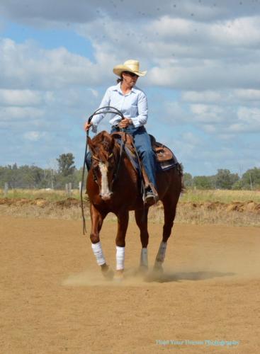 Sue riding Gracie, registered name Mondure Chics & Chex. She is a 3 year old filly that is currently preparing for the Gold Buckle Futurity in Tamworth this coming September (Photo: Jolene King - Hold Your Horses Photography) |