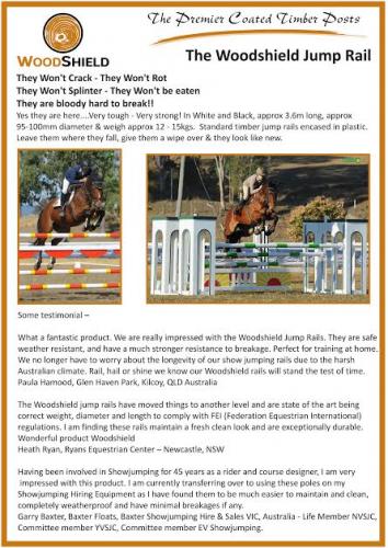 What a fantastic product. We are really impressed with the Woodshielf Jump Rails. They are safe, weather resistant and have a much stronger resistance to breakage. Perfect for training at home. We no longer have to worry about the longevity of our showjumping rails due to the harsh Australian climate. Rail, hail or shine we know our Woodshield rails will stand the test of time.
