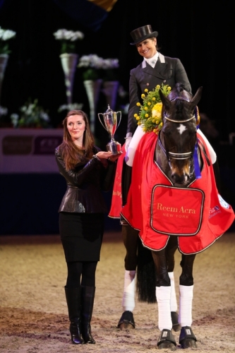 Tinne Vilhelmson-Silfven and Don Auriello being presented with the Reem Acra Cup by Reem Acra representative Heather Schmidt after the Swedish horse-and-rider partnership topped the fourth leg of the Reem Acra FEI World Cup™ Dressage 2012/2013 series at Stockholm, Sweden today. Photo: FEI/Peter Zachrisson Story: FEI/Louise Parkes |