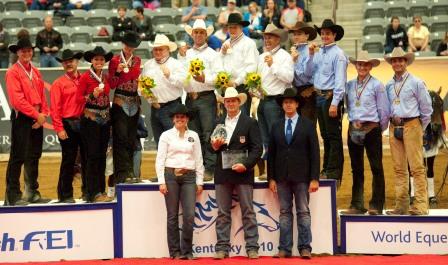 The host nation and defending double-champions from the USA scooped the first gold medals of the 2010 Alltech FEI World Equestrian Games™ when spinning, slide-stopping and galloping to a convincing victory in the Reining Team Championship at in Kentucky. They dominated the leaderboard when filling first, third, fourth and ninth places and their final score of 674.5 left them almost 10 points clear of Belgium in silver medal position while Italy took bronze. And it was an historic moment for the Belgians as they claimed their first World Championship title in this discipline.