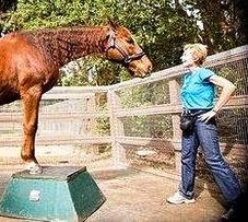 Lukas is seventeen years old and a former race horse who was abandoned because he didn’t do as well as expected on the race track. He was found starving in a yard when he was nine years old. Murdock was actually told to get rid of him when he was doing some things that people considered difficult, but she wouldn’t part with him. She taught him various activities like recognizing numbers, letters, colors, and shapes. He also does the Spanish Walk, Passage, curtsey, bow, rear, sit, jambette and other movements, without being forced. (Murdock does not use a whip.) He performs at non-profit benefits to raise awareness and funds.