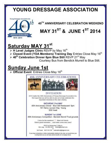 Young Dressage Associationa are holding their 40th Anniversary Celebration Weekend on 31 May - 1 June 2014, which will include a H Level Judges Clinic, Training Day and Celebration Dinner on Saturday, followed by an Official Event on Sunday.
