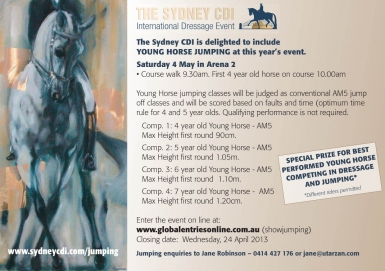 The Sydney CDI is delighted to include Young Horse Jumping at this year's event on Saturday 4 May.
