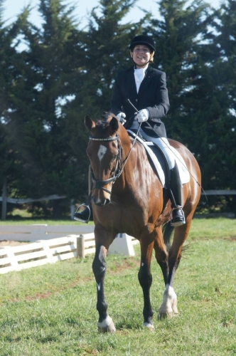 | Jan Herzig on Kendalee Jarrahman preparing to compete in the Preliminary sponsored by Rowville Horse Trailers |