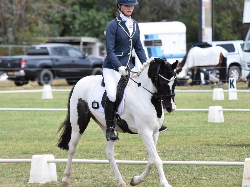 Pippa was purchased directly from breeder as a 2yo and has been well handled, exposed and corrected started undersaddle. She is confident and enjoys going out and about to different events and competitions. Has competed in dressage, ag shows and breed classes at multiple different venues. Has been well exposed on farm property, good with machinery and dogs, loves a ride out in company or alone. Has been ridden bareback and in a halter.