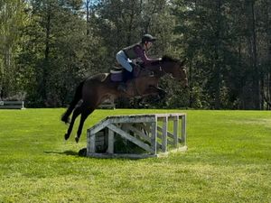 Schooled on the flat with leg yeilds and shoulder in, has never stopped at a jump very honest horse that will get you out of a bad stride.