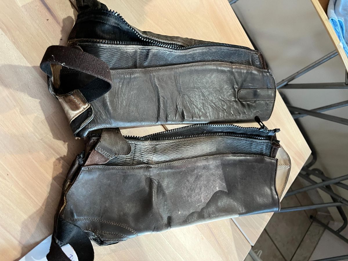 Dublin black soft leather chaps size XS $30 pair Dublin brown soft leather chaps size CM $30 per pair Dublin brown leather chaps size 40cm $30 per pair Eurohunter brown suede chaps size 3XS $20 per pair Brown kids jodphur clips free with any purchase of chaps