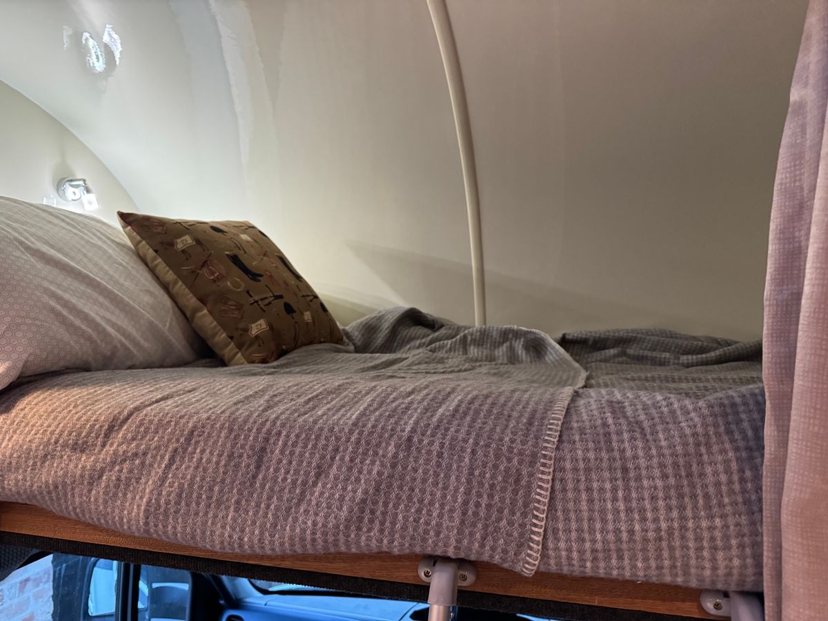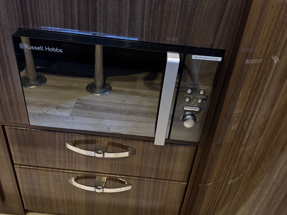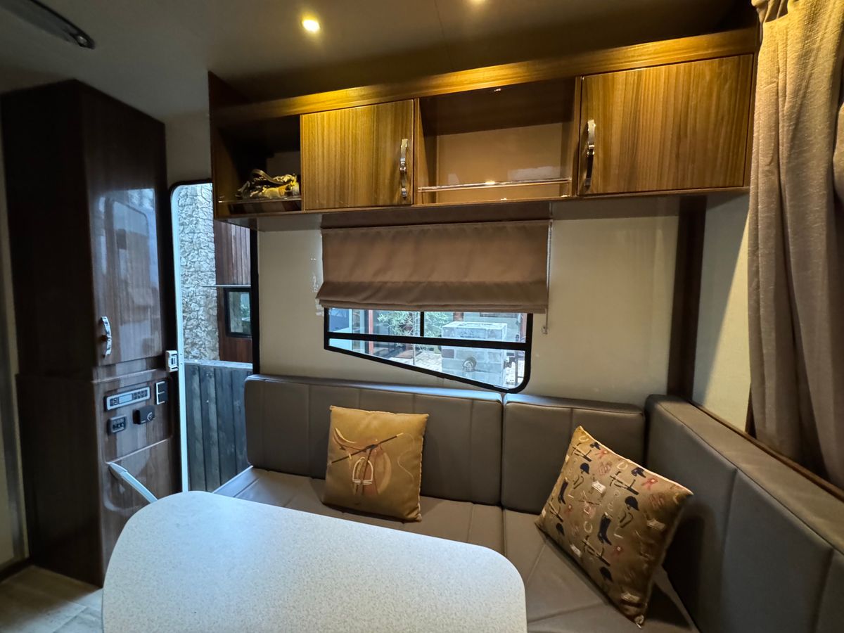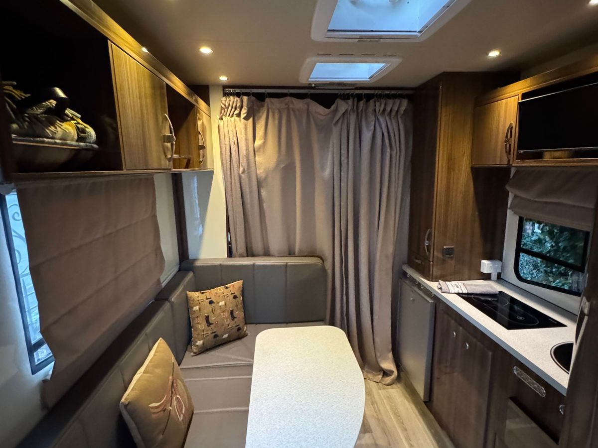 Living area features: beige leather upholstery, sleeping for 4 people (2 in luton peak), (table that folds to a 2nd bed for 2), TV & DVD player, Electric flushing toilet, wash basin, shower and vanity, storage cupboards wardrobe, microwave, diesel cooktop, diesel heating and hot water, 130 litre fridge.