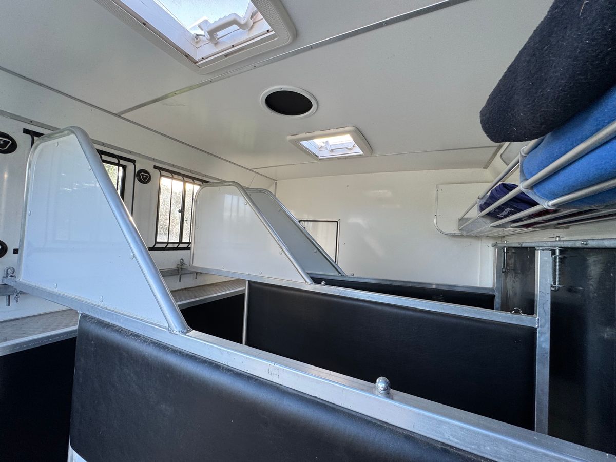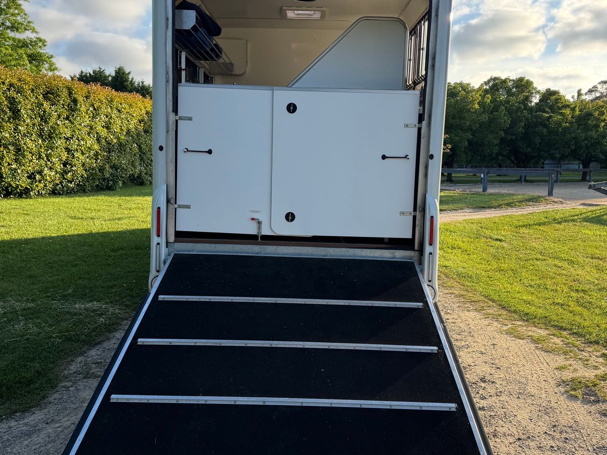 Horse area features: Horse shower hose, full length rug rack (3m) padded partitions, 1 x large roof vent, digital camera with 7" monitor reversing camera, tinted windows, 3 x outside lockers, electric roof extractor fan, push button hydraulic ramp.