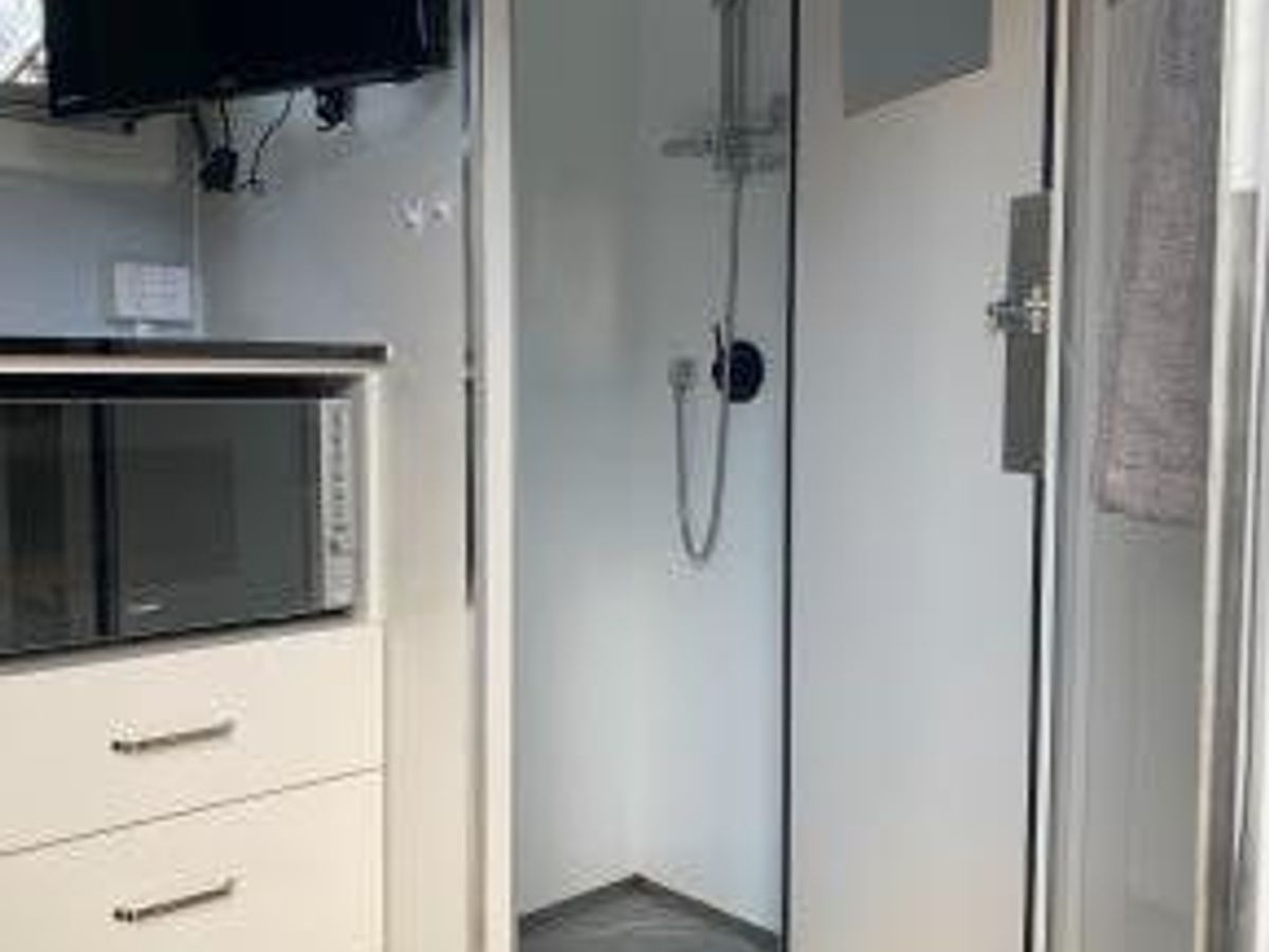 Full kitchen with microwave, 95L fridge (with freezer), sink, and ample storage